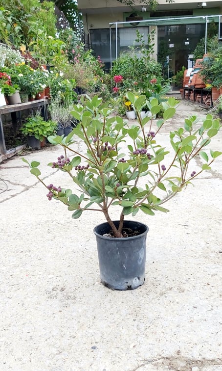 Αειθαλής θάμνος αργής ανάπτυξης με τελικό ύψος το 1,50m. Ανθοφορεί από τον Μάρτιο μέχρι τον Αύγουστο με λευκά αρωματικά άνθη τους πρώτους μήνες που στη συνέχεια μεταχρωματίζονται σε ροζ απαλό. Τα φύλλα του είναι δερματώδη σκουροπράσινα κι έχουν σχήμα ωοειδές. Αρχές του φθινοπώρου τα άνθη μετατρέπονται σε μωβ-κοκκινους καρπούς. Δε χρειάζεται ιδιαίτερες περιποιήσεις. Φυτεύεται μόνο του ή σε συστάδες.. Ιδανικό για χαμηλούς φράκτες.