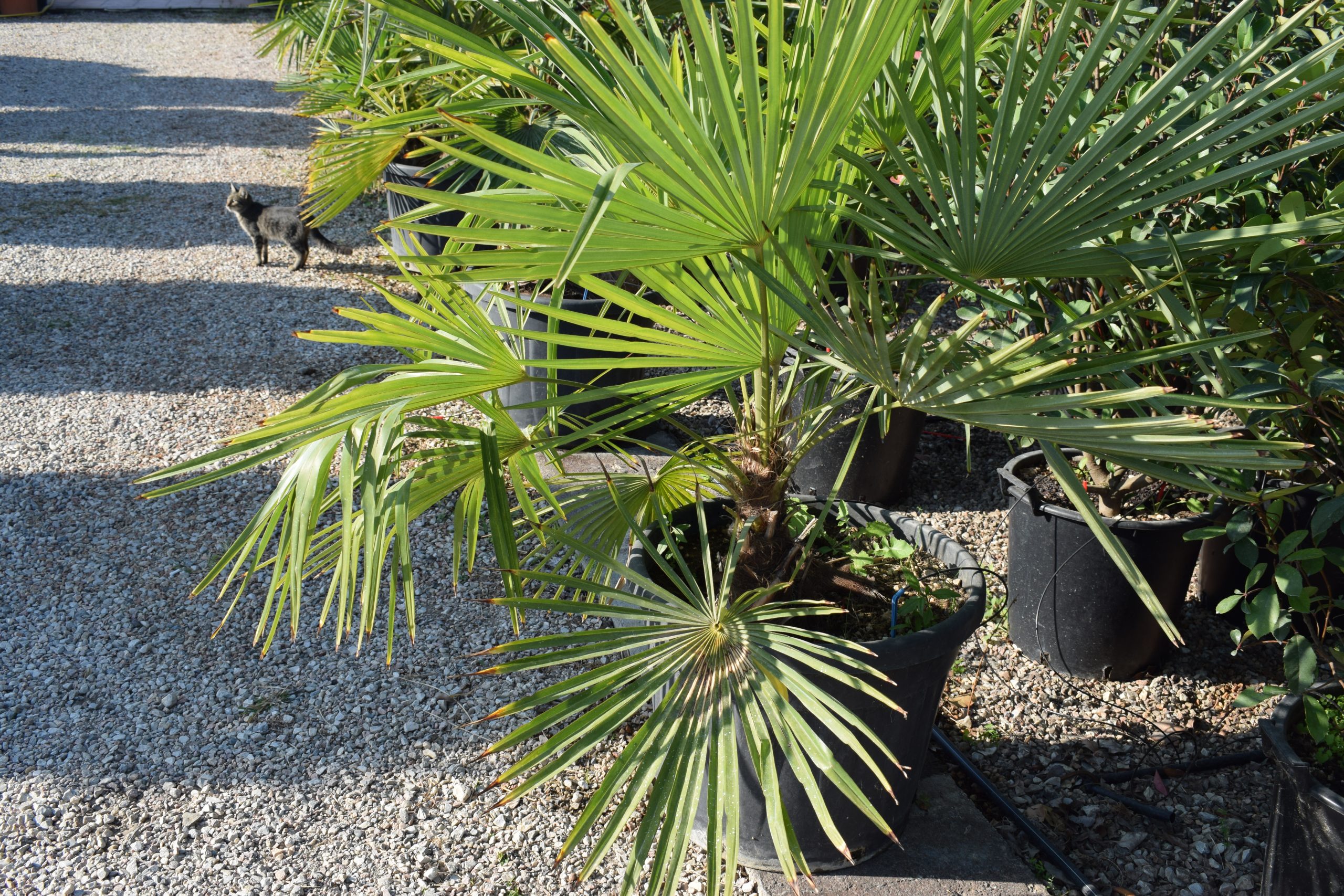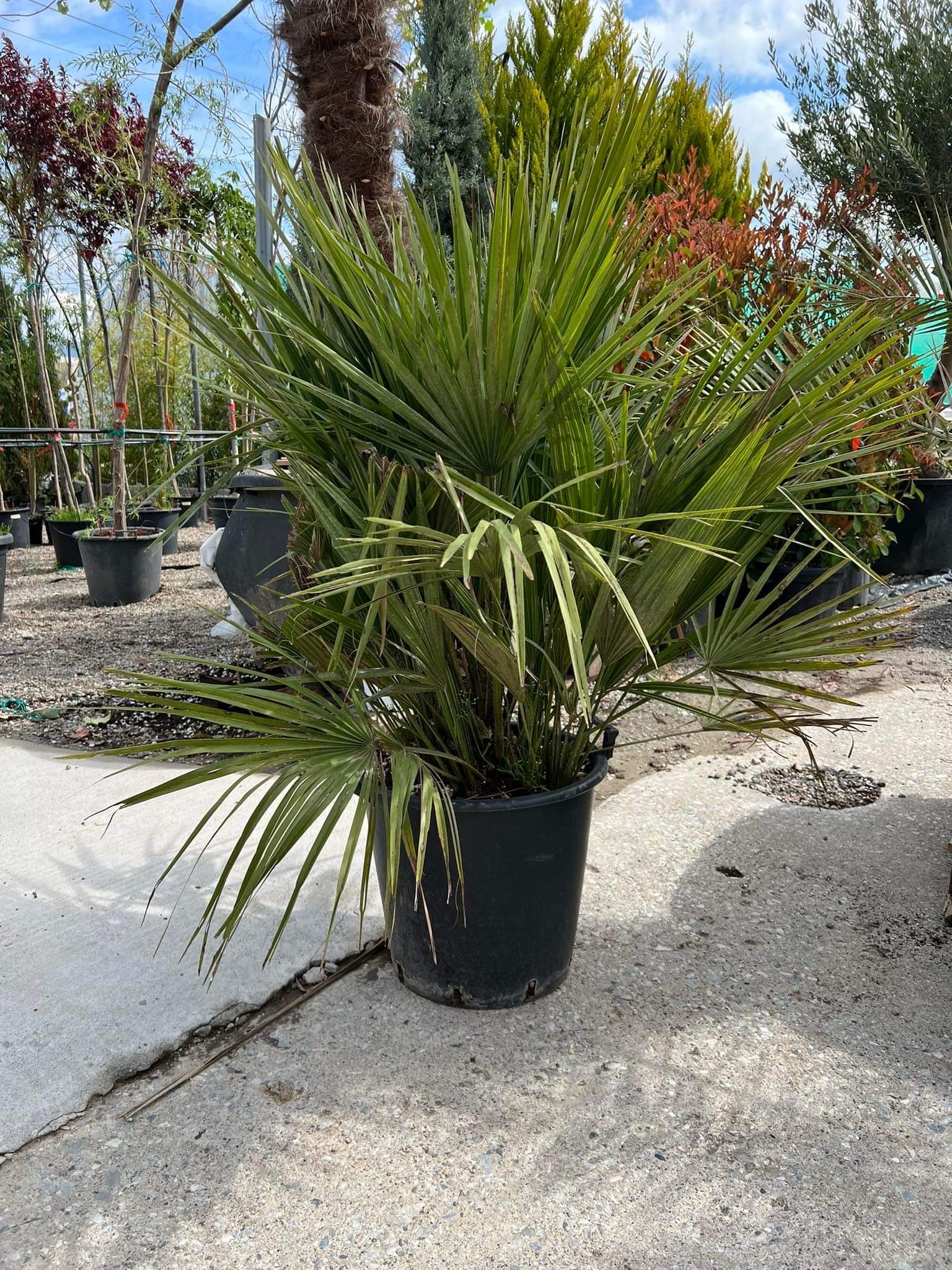 Διαθέτει πράσινα παλαμοσχιδή φύλλα με αγκαθωτούς μίσχους. Έχει πολλαπλούς κορμούς που ξεκινούν από τη βάση και σχηματίζουν πλατιά κόμη.