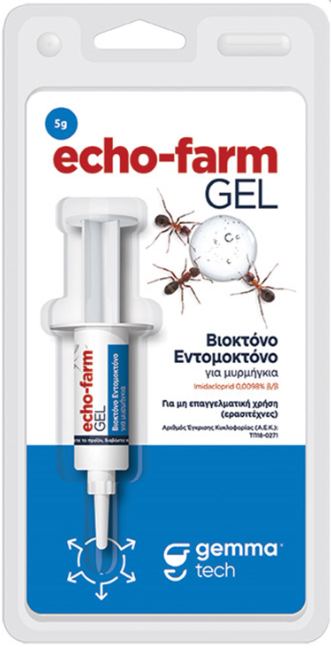 To Echo-farm GEL είναι ένα ετοιμόχρηστο εντομοκτόνο δόλωμα για μυρμήγκια σε μορφή τζελ. Το Echo-farm GEL μπορεί να χρησιμοποιηθεί σε εσωτερικούς χώρους και σε εξωτερικούς χώρους, περιμετρικά κτιρίων. Να διαβάζετε πάντα την ετικέτα πριν από τη χρήση και να ακολουθείτε τις οδηγίες που δίνονται.