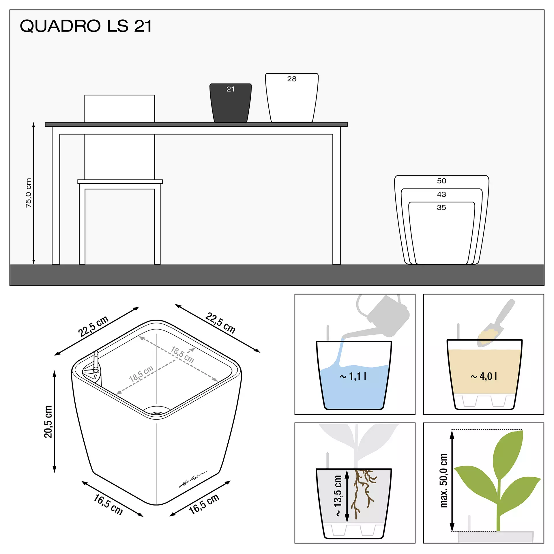 QUADRΟ LS με την εκλεπτυσμένη εξωτερική της όψη έρχεται σε πέντε μεγέθη και υπόσχεται να αναδείξει κάθε γωνιά του χώρου σας: τοποθετήστε την QUADRO LS 21 πάνω στο τραπέζι σας, την QUADRO LS 43 στο νέο σας σπίτι και την QUADRO LS 50 στις ξενοδοχειακές εγκαταστάσεις ή στον εργασιακό σας χώρο. Με την QUADRO LS η διακόσμηση δεν έχει όρια: ακόμα και οι QUADRO 43 και 50 μπορούν να μετακινηθούν χάρη στα ειδικά σχεδιασμένα ροδάκια. Με το δοχείο φύτευσης η αντικατάσταση του φυτού σας γίνεται παιχνιδάκι.